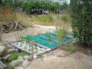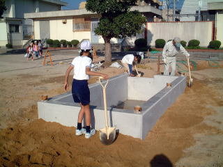 コンクリートと周りの土との間にすき間があったので,土を入れてあぶなくないようにしました。 このときはまだ水は入っていません。 |