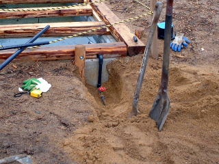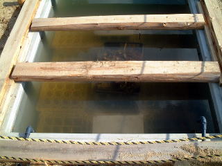 | 池にむけて流すための水をためるところ。 深さは1メートルくらいあり,まちがって落ちたらたいへんなので,底にビールケースをしずめています。 |