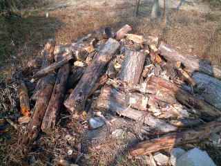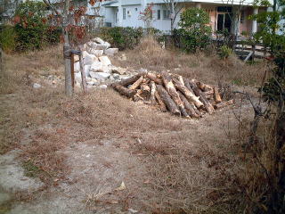 生き物のすみかとして,シイタケさいばい用の木を重ねておいています。本物のシイタケが生えてきて,びっくりしました。 この木は,加計町の方からいただきました。 |