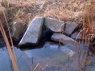 メダカなどの生き物が流されてしまわないように,ネットがしてあります。ただこのネットのせいで,藻(も)などがつまってしまって水が流れず,あふれてしまうこともありました。 ふだんはつついてほしくないのですが,たまにはネットにつまった藻(も)をそうじしないと,排水口の役目をはたさなくなってしまいます。 |