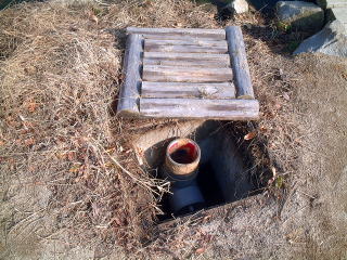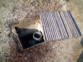 排水口を通った水は,この枡(ます)に来ます。排水口からたくさん水が流れてくると,パイプの上からあふれて,そのまま下水管に流れこむようになっています。 写真をとるために,わざとふたを開けていますが,いつもはぜったいに開けてはいけません。 |