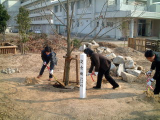 | 2003・1・7 記念植樹(きねんしょくじゅ) ビオトープ完成をおいわいして,PTAよりクヌギとコナラの木をいただき,植えている様子です。 |