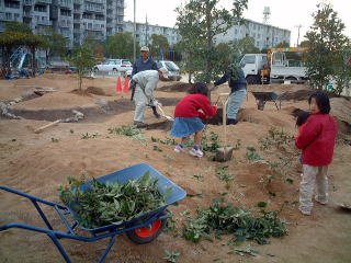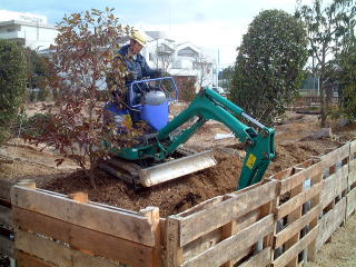 | 2002・11・18 木を植える 小山などができあがったので,アラカシ,サザンカなどの木を植えていきました。 |