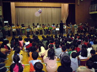 | 2002・12・4 ビオトープ完成式 ブラスのえんそう 完成をおいわいする式は,ブラスアンサンブルのすてきなえんそうから始まりました。 |