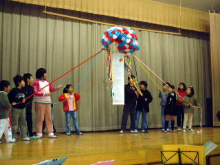 | 2002・12・4 ビオトープ完成式 くす玉わり たれまくには,「明神生き物王国」と書かれています。この名前は児童みんなで考え,児童会で決めました。 |