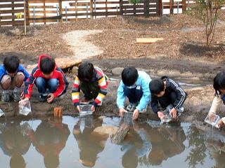 | 2002・12・4 ビオトープ完成式 メダカの放流 体育館の式の後,ビオトープの池にメダカを放流しました。テレビ局も来ていて,この日のニュースで取り上げられました。 |