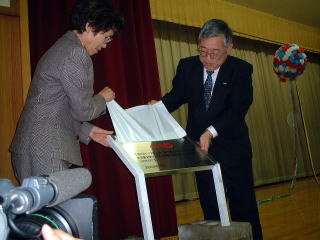 | 2002・12・4 ビオトープ完成式 じょまく ビオトープのかん板のじょまくをしました。この後,ビオトープの中に設置しました。 |
