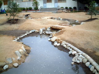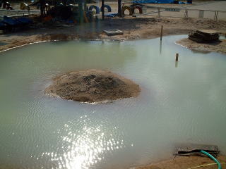 | 2002・11・1 池への水入れ できあがりではなく,こまかいすなをしずめて,水もれをなくすために行いました。 |