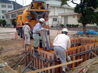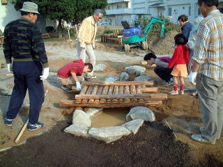 | 2002・11・16 水底のしあげ 水が流れるかたむきを考えて,しんちょうにかためていきました。 |