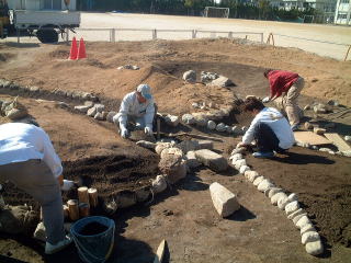 | 2002・11・17 石ならべ 土と水のさかいに石をならべました。こうすることで,土が池に落ちにくくなります。 |