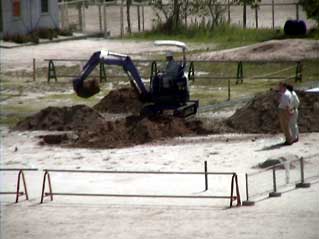 | 2002・10・11 工事の始まり 測量(そくりょう)を行った後,機械を使って水の通り道や池をほり進めていきました。 |
