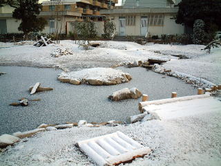 2003年1月,めずらしく大雪となりました。 池も一面氷におおわれました。 |