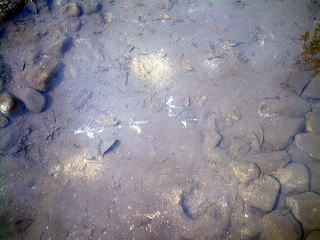 水を入れ,すなを入れ,水をぬく,を何度かくり返しました。 こまかいすなのつぶが底のすき間に入りこんで,水もれを少しでもなくそうとしました。 水をぬいたすぐあとのようすです。 |
