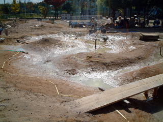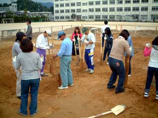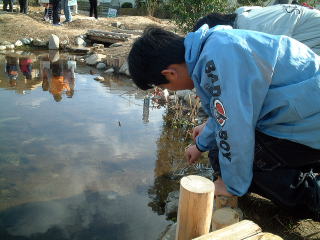 ビオトープ完成式の後,完成をおいわいして,メダカを放流しているようすです。 後ろに見えているのは,通り道と,通ってほしくないところを表すためにまいたチップ(木のくずやかけら)です。ただ,チップは1年たった今では,見るかげもなくなってしまいました。 |