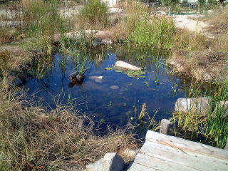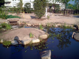 | ビオトープの中でいちばん注目を集めるところで,シンボルともいえるところです。 たくさんの水生植物やメダカ,やごなどが生きています。 新せんな水がいつも流れてくるようにしてあります。 作られたときは,まん中は完全な島だったのですが,水の流れが2つに分かれるとつごうが悪いことに気づいたため,一方をうめ立てました。 |