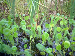 きみょうなアンテナみたいな植物がウチワゼニクサです。 はじめはだれも名前がわかりませんでした。外来種(もともと日本にはなく,ほかの国からやってきたもの)で,田の土といっしょに来たのではないかという話です。 一気に池全体に広がるほど強い力を持っています。 また,寒くなっても,かれるようすはありません。 |
