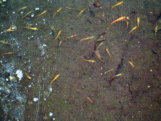 元気に泳ぐメダカです。色から分かる通り,おもにはヒメダカです。このほか,ふつうのメダカやカダヤシも池に放しました。 |