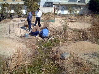 | できるだけ自然のままのすがたにしたいのがビオトープです。けれど,生き物が住みやすいようにしようと思うと,どうしてもきれいな水の流れがひつようだということで,水をくみ上げるポンプと水道を取りつけることになりました。 |