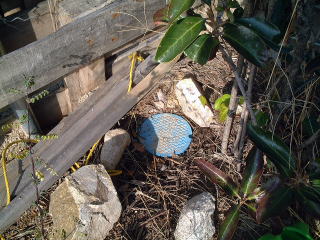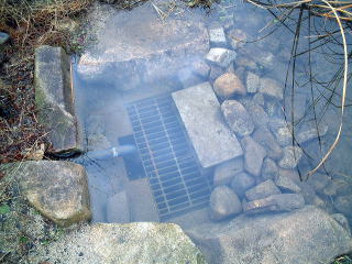 ポンプスイッチのすぐ横にあるのが,水道水をちょ水そうにいれるための栓(せん)です。 水道水が多すぎると池の水があふれてしまうし,少なすぎるとかれてしまうので,ちょう度よい量にしてあります。 いつもは大きな石の下にかくしてあります。これもかってにさわらないようにしましょう。 |