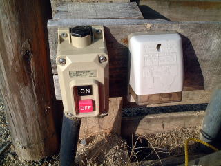 池の水をちょ水そうにくみ上げるためのポンプスイッチです。ビオトープの門の左がわ(下の方)にあります。 いつも「ON(オン)」になっていて,水をくみ上げています。 むき出しになっていますが,よい子のみなさんは決してかってにさわったりしないでください。 |