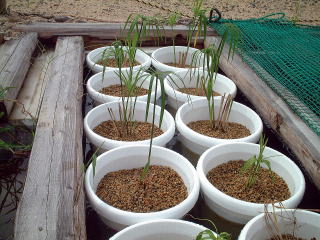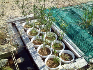 2003年10月のようすです。 2か月の間にずいぶん大きくなったことがわかります。池にも1つだけ,茶色のはちに入ったシュロガヤツリがあります。 |